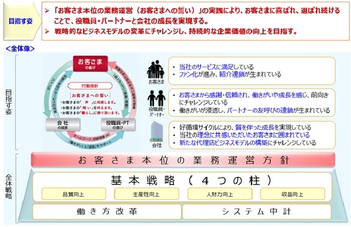 当社は、「大切にする価値観」を実現するため、お客さまから「ありがとう」の言葉をいただくことを喜びとし、保険の枠に捉われず、お客さまにとって最適なサービスをご提供することができるプロフェッショナル集団を目指します(ビジョン)。より具体的な計画として、2021年度を開始初年度とする3か年の中期経営計画(2021〜2023年度)を策定しました。本中期経営計画では、すべての取組みにつながるお客さま本位の業務運営の実践と昨今の保険業界を取り巻く環境変化を機会と捉えた戦略的ビジネスモデルへの変革にチャレンジしてまいります。