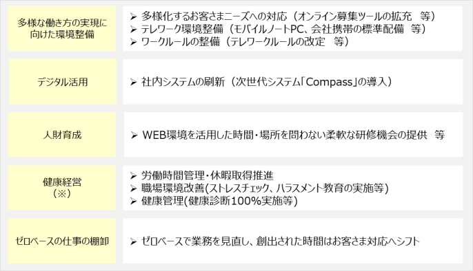 当社は、この変化をチャンスと捉え、従来の延長線上にない発想で、役職員・パートナー一人ひとりの働き方や組織運営を見直し、生産性を向上します。生産性向上により創出された時間は、「お客さま対応」へとシフトすることで、持続的な企業価値の向上を目指します。また、多様でフレキシブルな働き方を志向し、その実効性を高めることで、役職員・パートナー一人ひとりが働くことの「使命感と働きがい向上」を実現します。